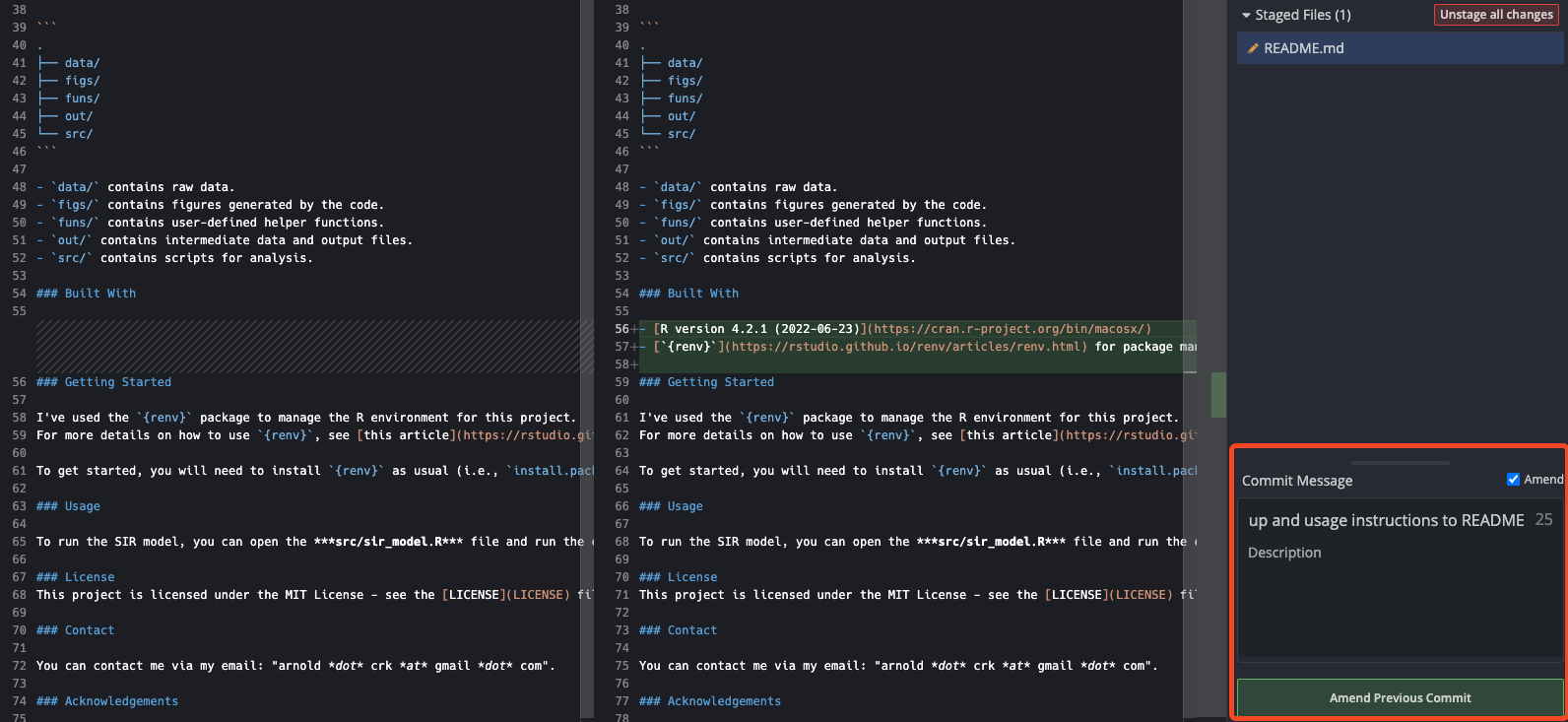 Once we’ve made and saved the changes to the README.md, we can stage them and then amend the previous commit.