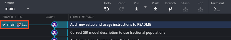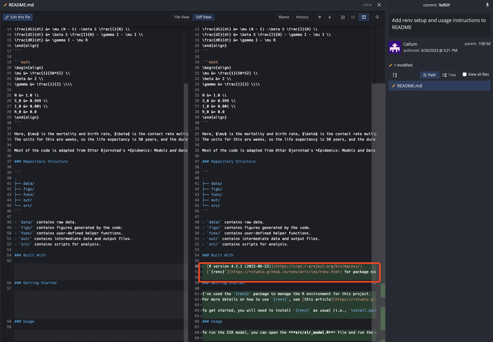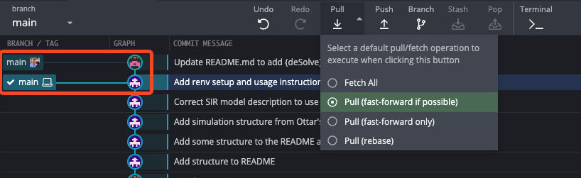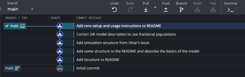 - [`{deSolve}`](https://cran.r-project.org/web/packages/deSolve/index.html) for solving differential equationsWhat you will notice is that when I make this change, it will be reflected in the Git history on GitHub, but not in your local repository. However, this will discrepancy will not immediately be apparent, as our computer hasn’t checked in with GitHub to see if there are any changes since we last pushed. To do this, we will use the fetch command.