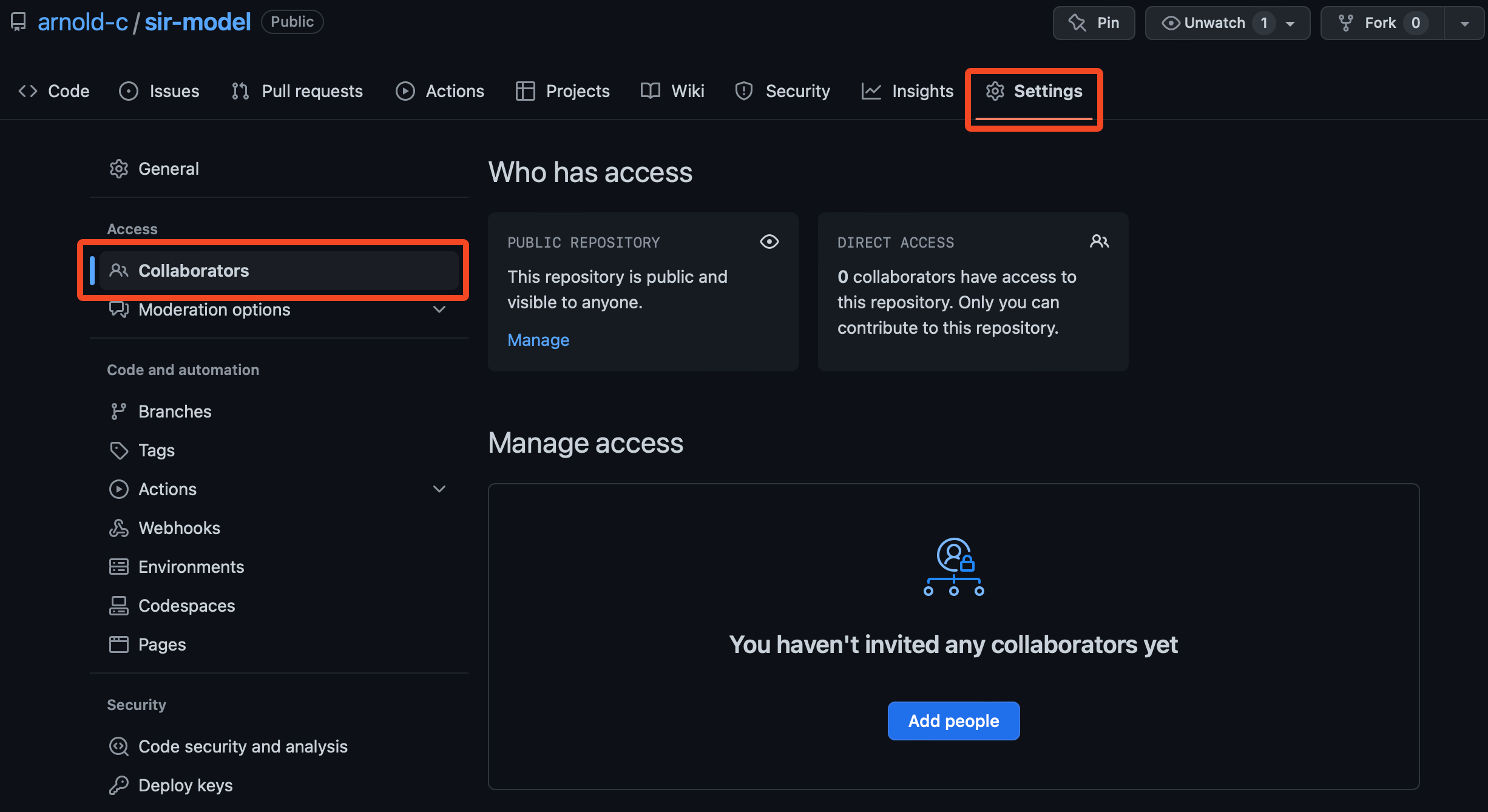 You can see that there are no collaborators at the moment, but click on the “Add people” button to add me as a collaborator. From here, you can type in my GitHub username, arnold-c, and then click on the “Add arnold-c to this repository” button.