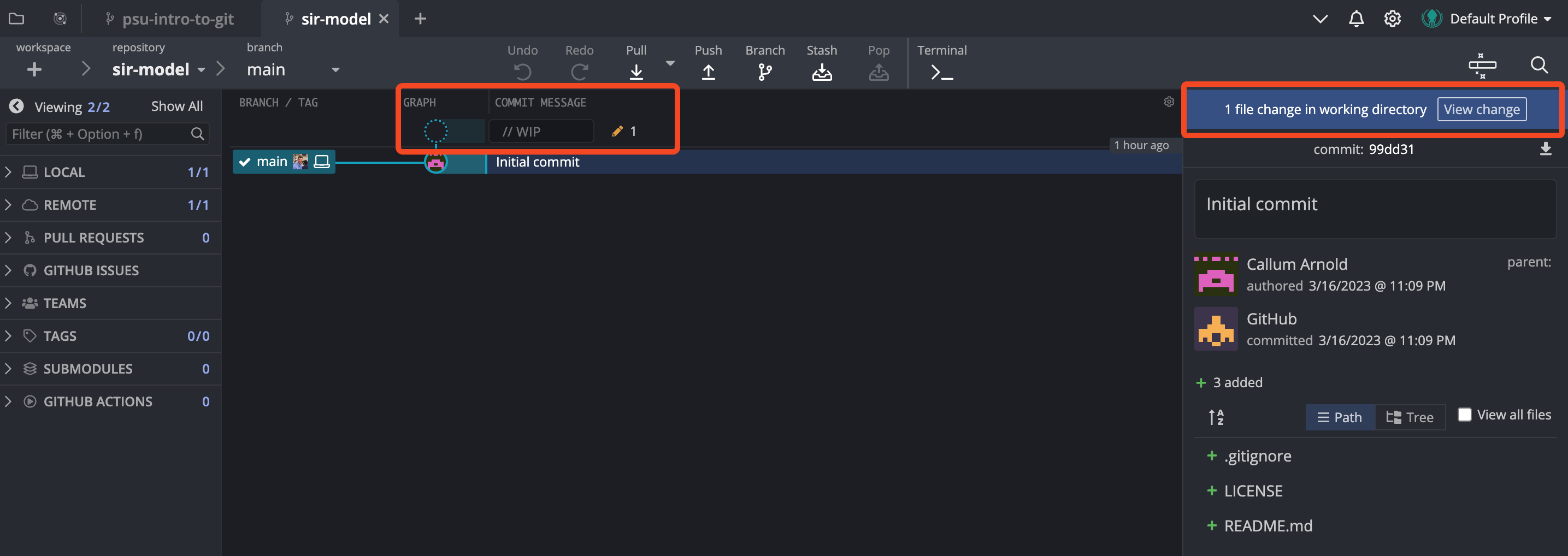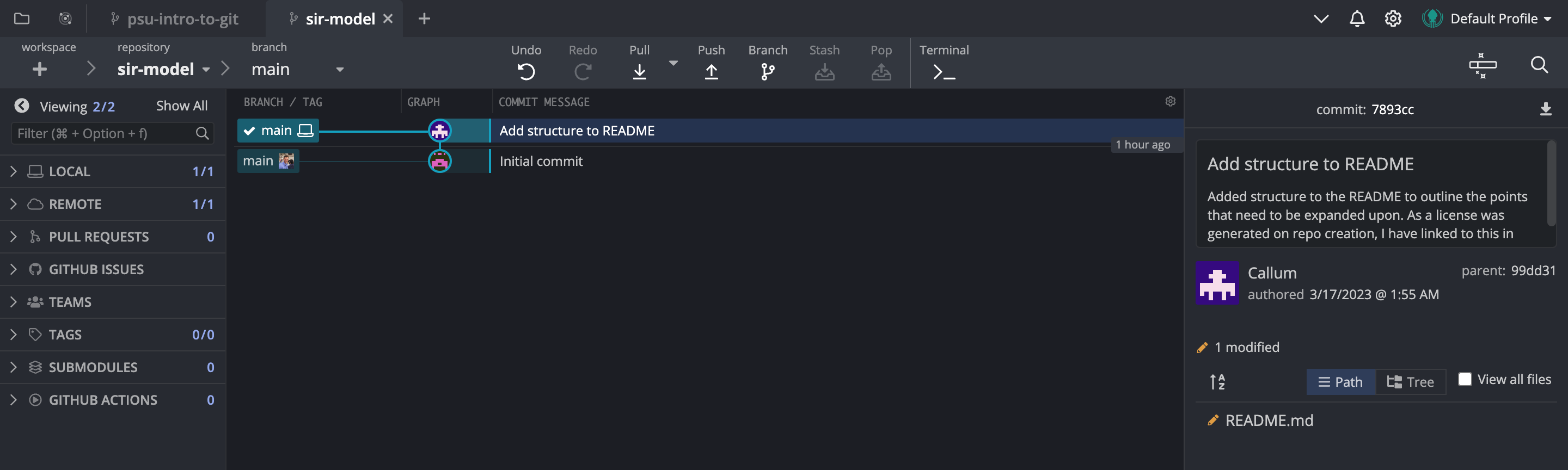 Now that we’ve made our first commit, we will see that the pencil icon has disappeared and we have a similar view to what we started with when we cloned the repository. The key difference is now there are two main branches being shown in the Git history. The one with the computer that is highlighted is the local branch, which is the branch that is stored on our computer. The other branch is the remote branch, which is the branch that is stored on GitHub. Because we’ve just made a commit, the local branch is ahead of the remote branch by one commit as we haven’t pushed our changes to GitHub yet. We’ll do that later after we’ve added a few more things to the README.