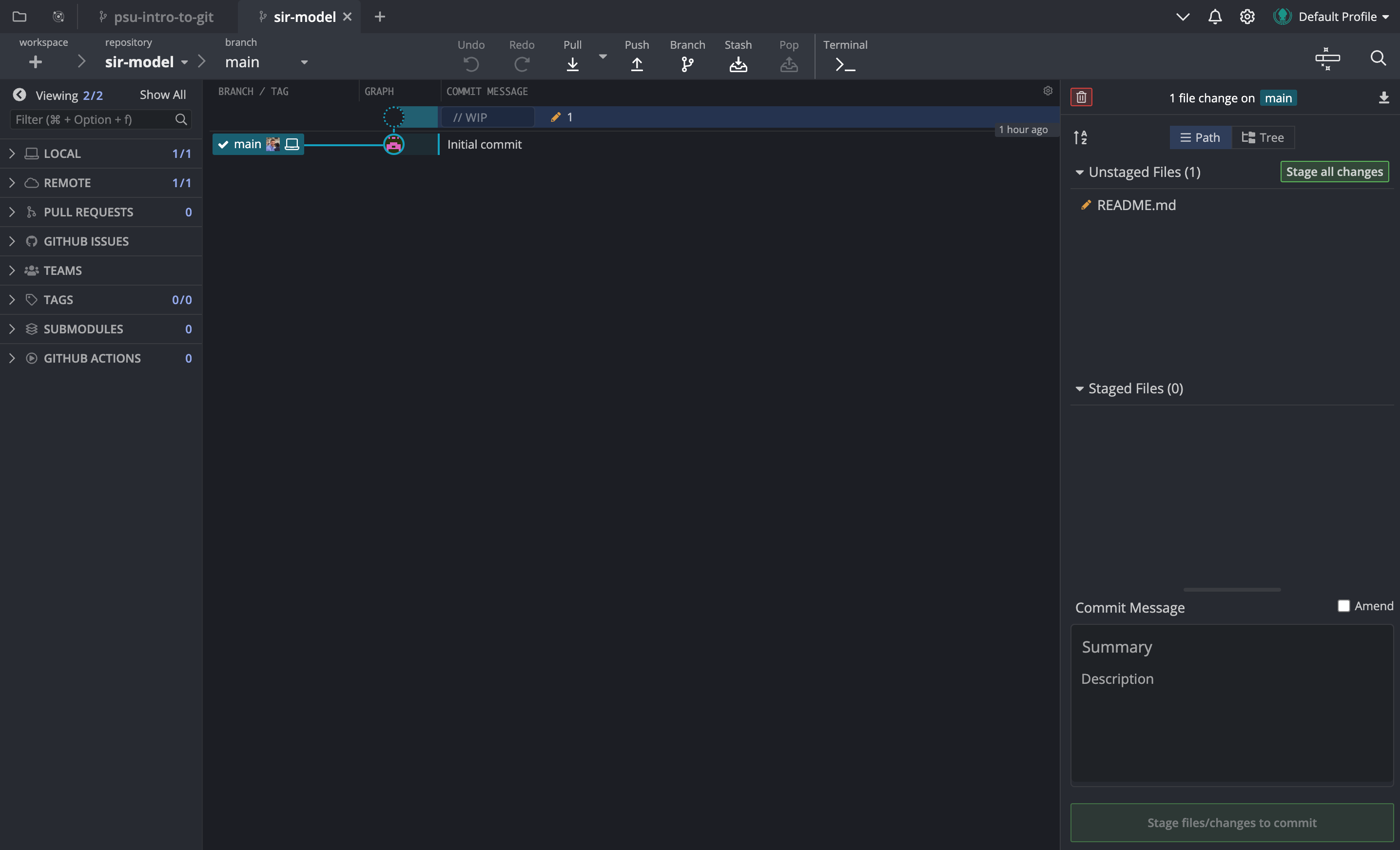 At this stage, we have a repository with a README, but we haven’t actually saved any changes to the repository as far as Git is concerned. When we cloned our repository, the README.md only contained the text that GitHub added by default (the repo name and short description - you can check this on GitHub if you’d like). If you open up GitKraken, you’ll see that it is showing that we have made changes to a file, indicated by the pencil icon in the commit history section, as well as the note above the commit message box that says “1 file change in working directory”.