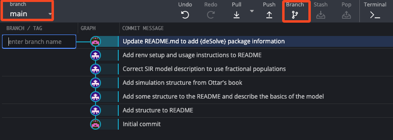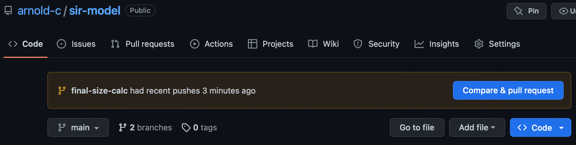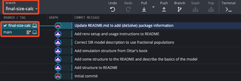 Let’s say that we want to add some code that calculates the final size of the epidemic for a range of transmission parameters (i.e., varying \(R_0\) to adjust \(\beta\)). Because our desired feature is a nice discrete piece of work that isn’t dependent on other work, we can make a branch for it. Importantly, it’s a relatively small and self-contained feature so it shouldn’t proliferate into a long-lived branch as we work on it i.e., we shouldn’t end up in a situation where there is a never-ending list of tasks to perform before we can consider the feature complete.