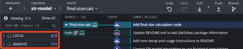 After entering a name, a new branch will be created, and we can see that we’re now on the new branch, final-size-calc. Hovering our mouse of the branch icon, we can see that both main and final-size-calc are listed, and we can switch between them by double-clicking on the branch we want to switch to. This also shows that both branches are currently at the same commit, as indicated by the horizontal marker pointing to the same commit.