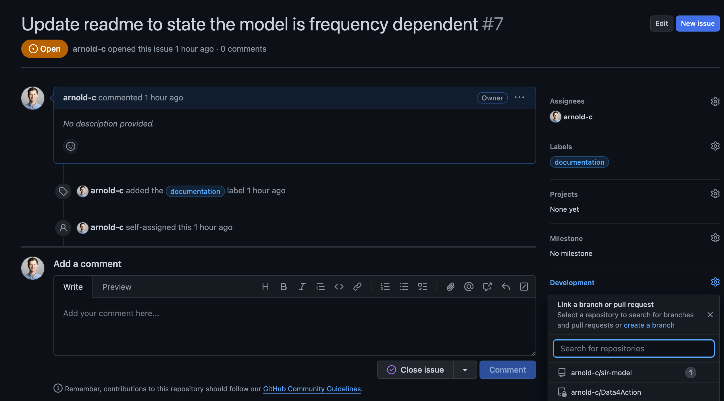 To do this, I’m first going to create a GitHub issue for the new change we want to make. This is simply going to be an issue with the “documentation” label that states the need to distinguish the model as frequency dependent in the README.md file. Then, I’m going to create a new branch for the feature we want to work on. However, before I create a new branch, I’m going to checkout the main branch, which is the one that contains the code we want to work on (your collaborator would not be creating a new branch off your short-lived branch).