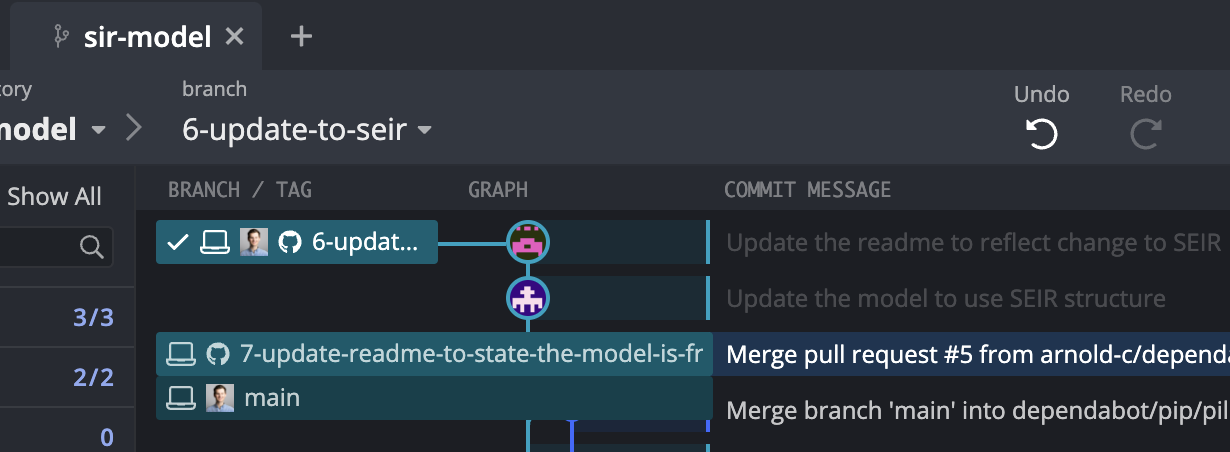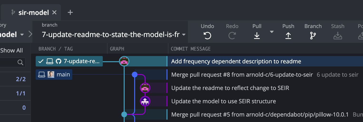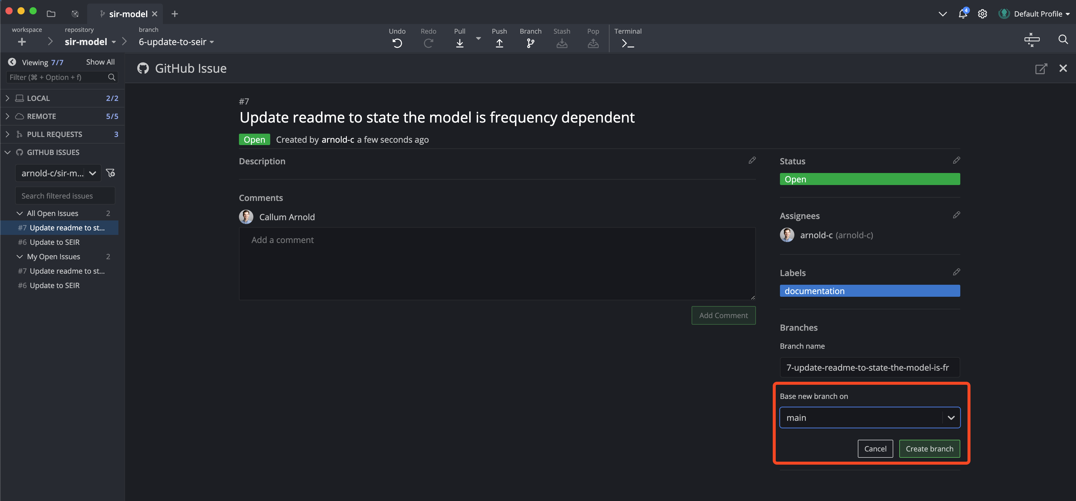 For example, say I have just added my final size calculation code and I realize that I want update my model to be an SEIR model instead of an SIR model. I could just make a new branch and be done with it, but creating an issue allows us to track which commits are involved in the change. It also allows us to outline a number of changes we wish to make over the next short while and link them, making it easier to remember what we wanted to do when we come back to a project, as well as who was working on the changes.
