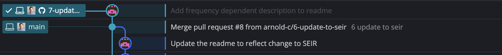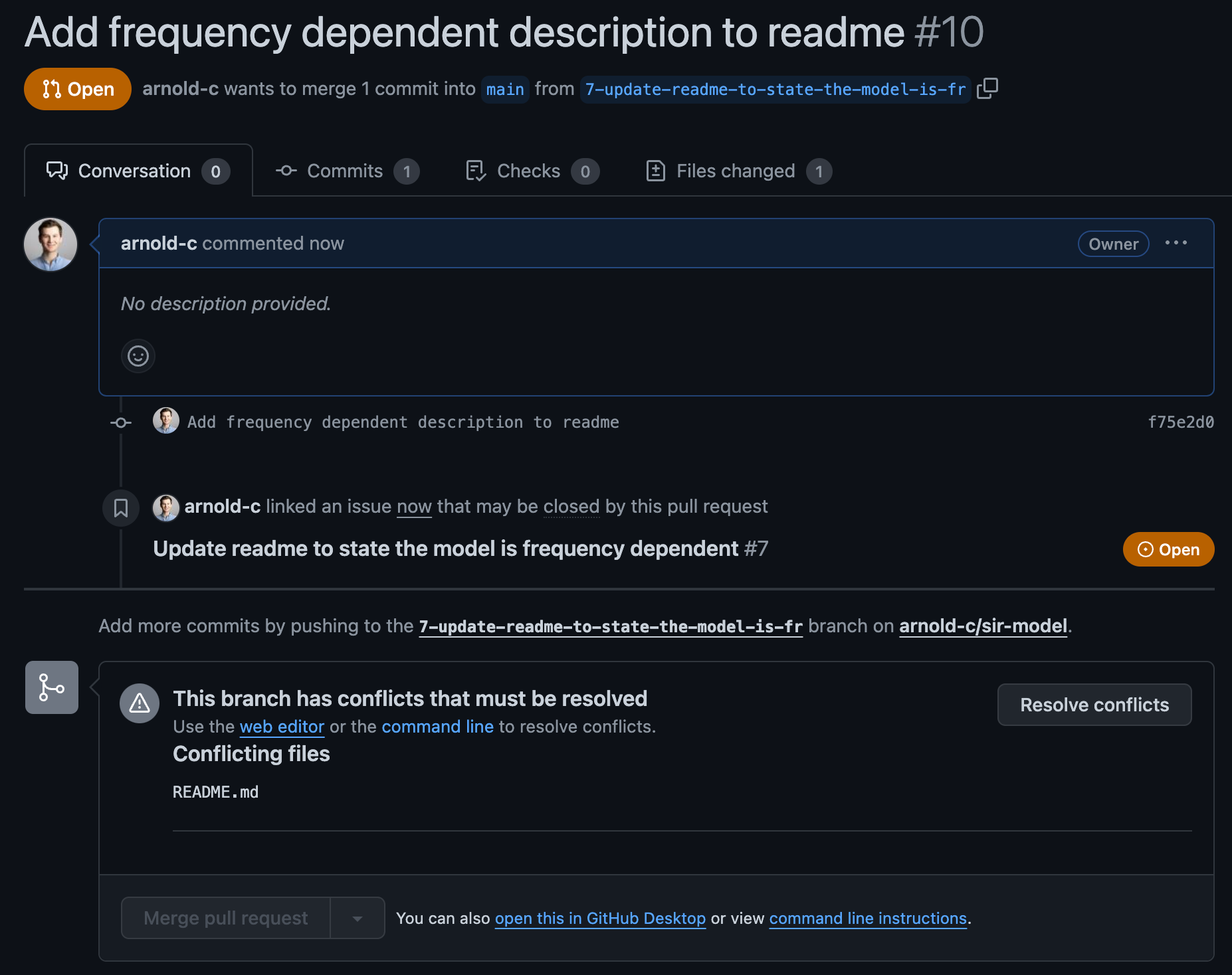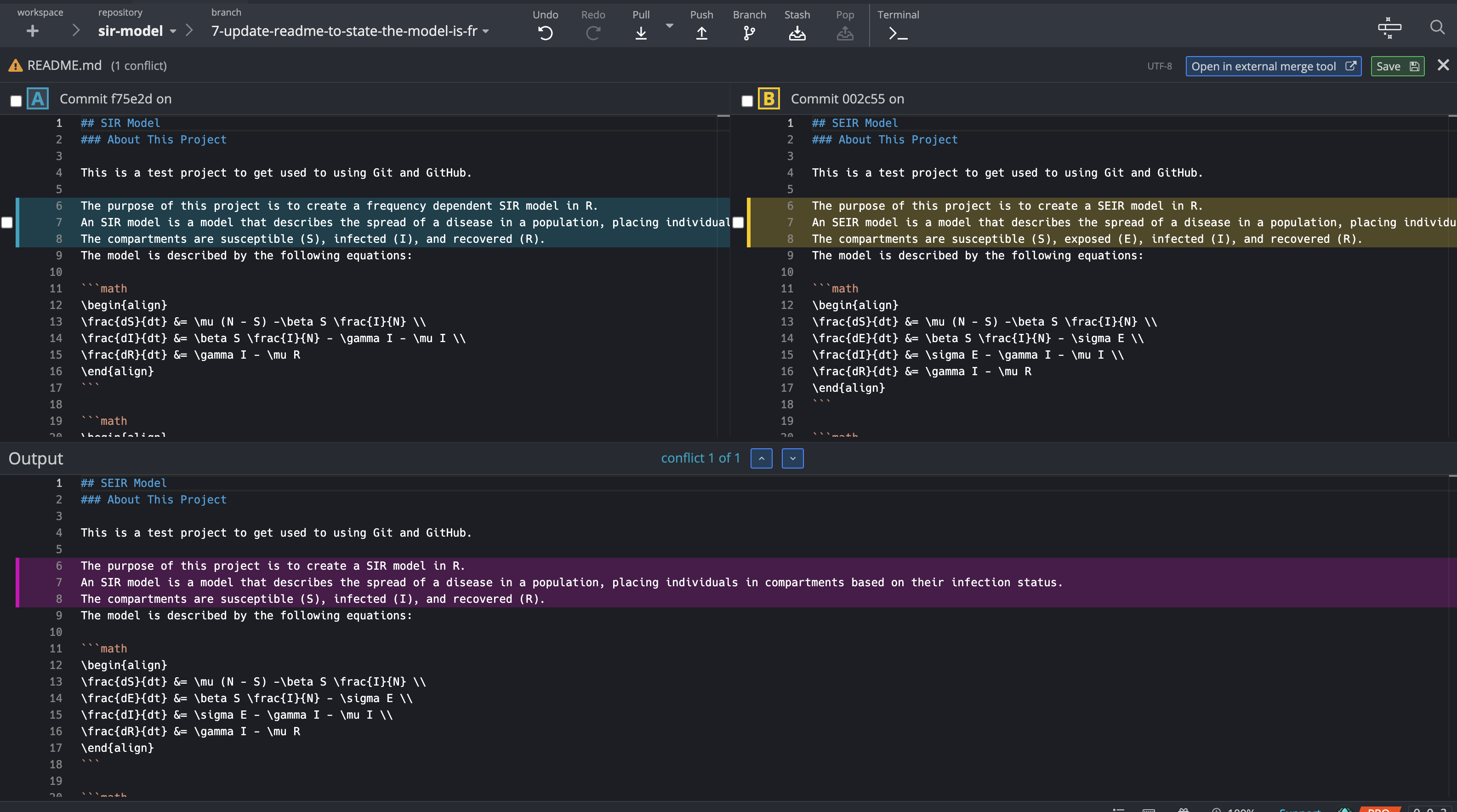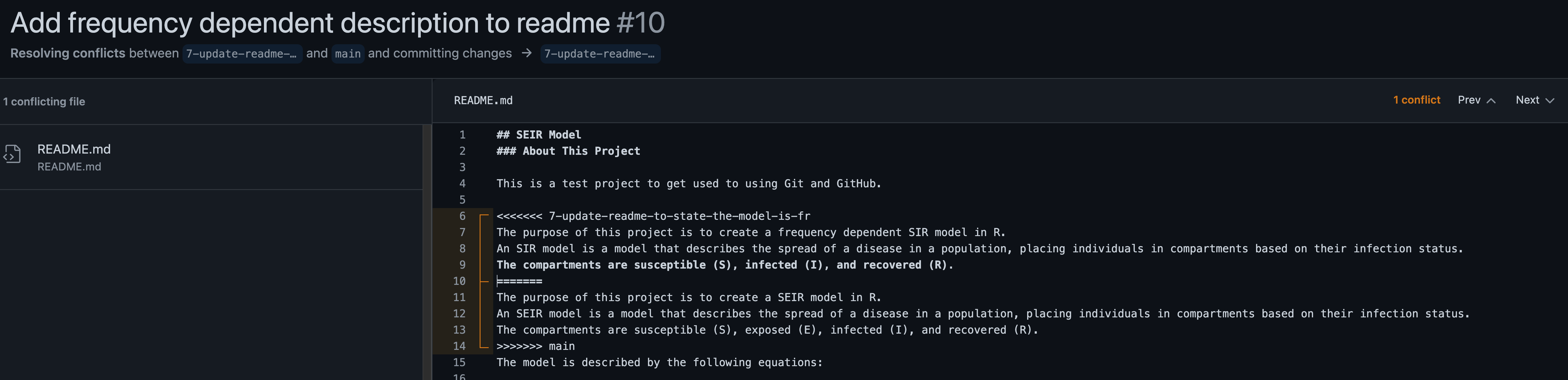 More often than someone working on the same feature as you at the same time, you will split up the tasks between individuals. You may be working on updating the model to use the SEIR structure, and your collaborator will be working on a different feature, for example, editing the README.md file to be more descriptive about the model - it is a frequency dependent model as we are scaling the transmission terms by \(N\).