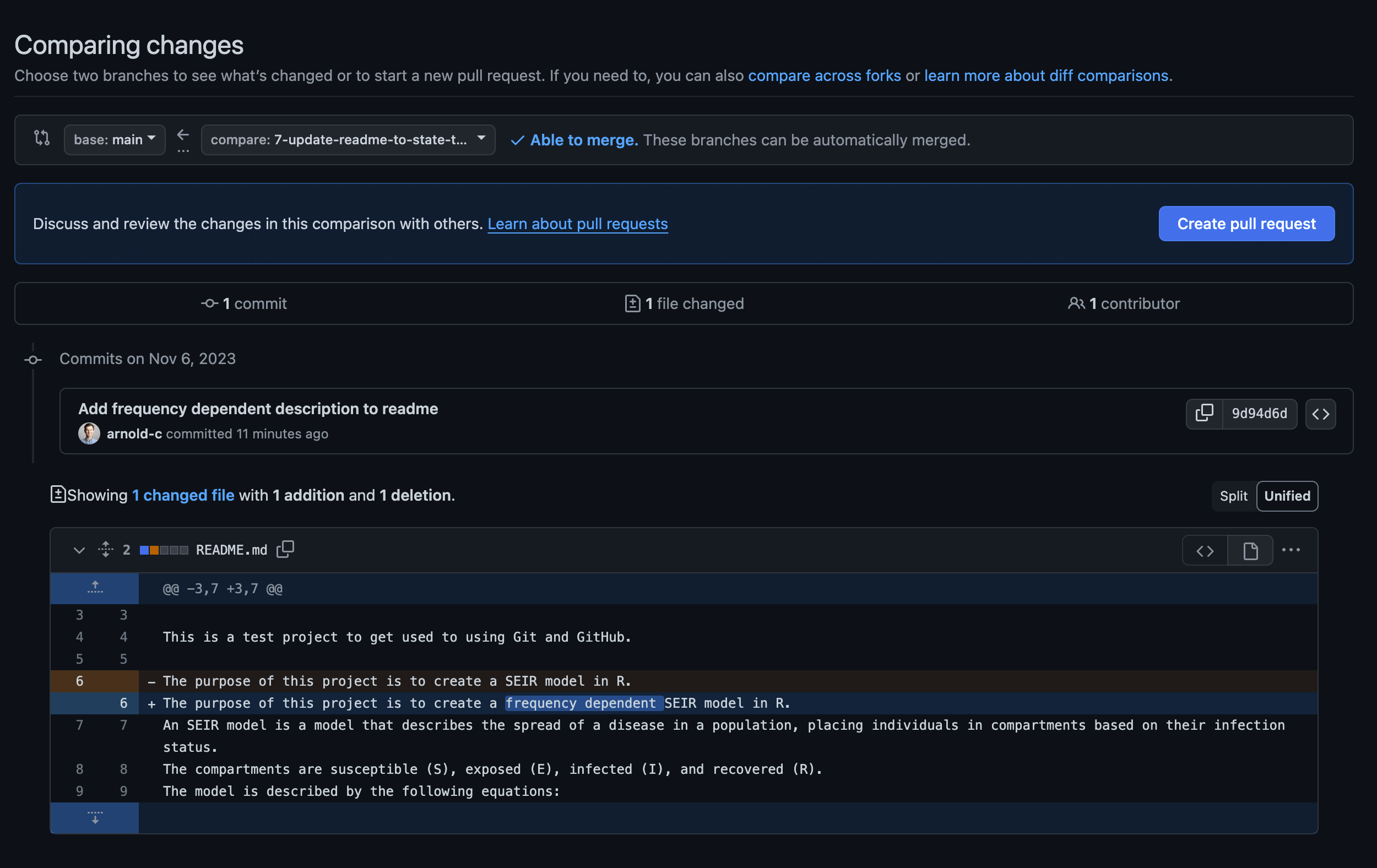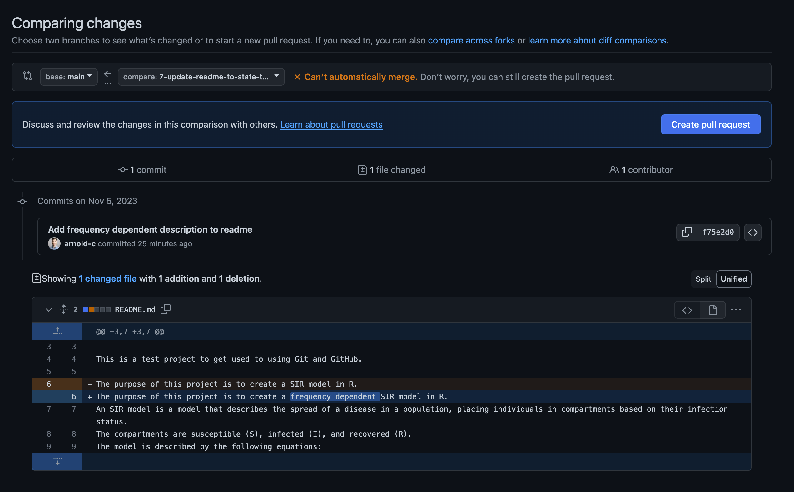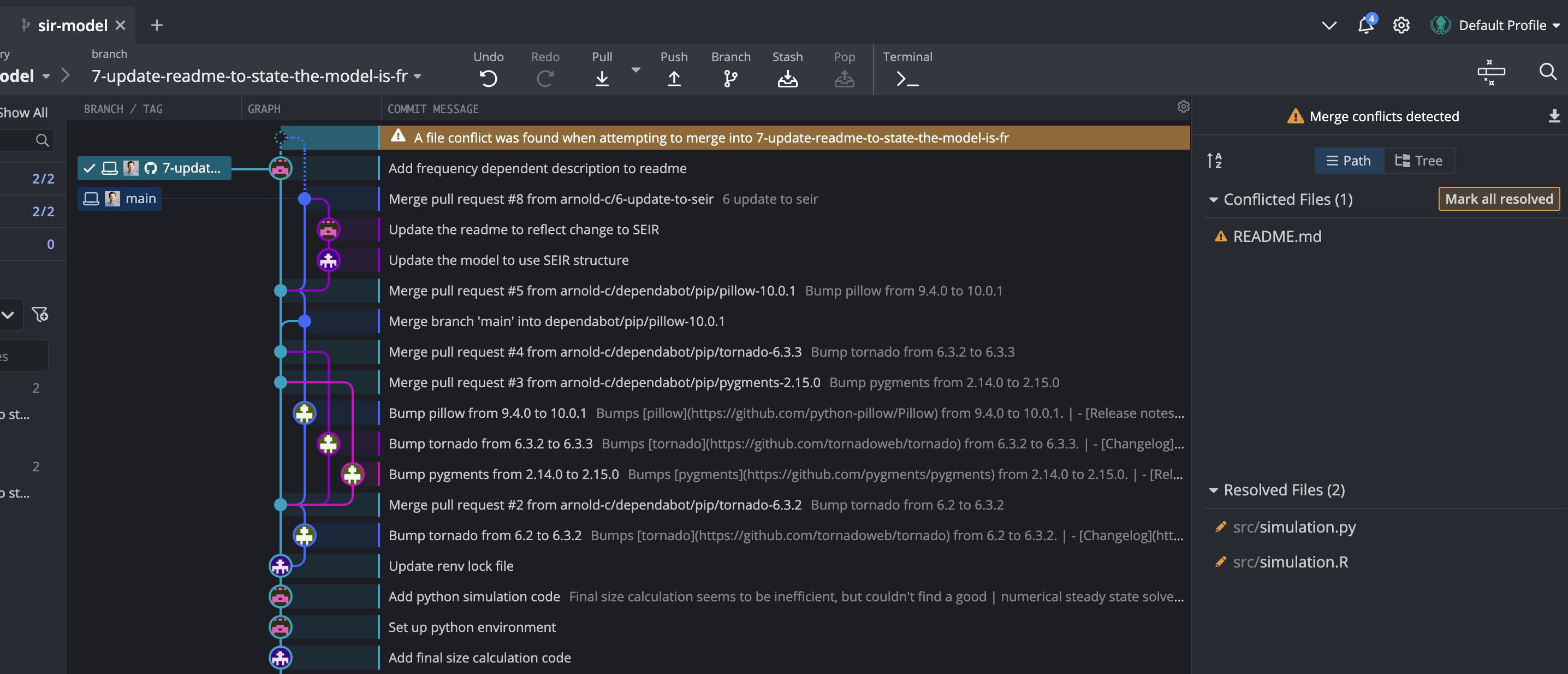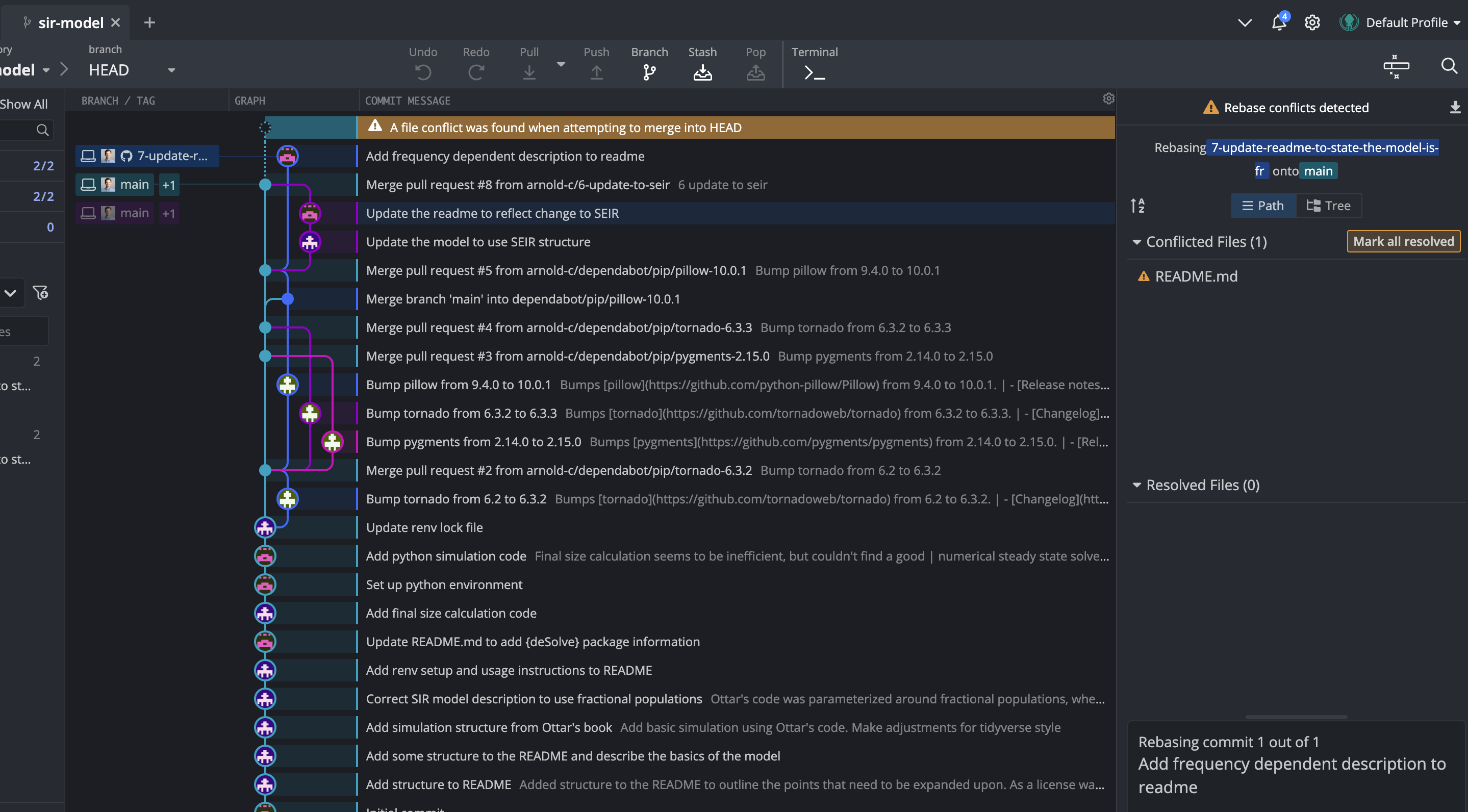 More often than someone working on the same feature as you at the same time, you will split up the tasks between individuals. You may be working on updating the model to use the SEIR structure, and your collaborator will be working on a different feature, for example, editing the README.md file to be more descriptive about the model - it is a frequency dependent model as we are scaling the transmission terms by \(N\).