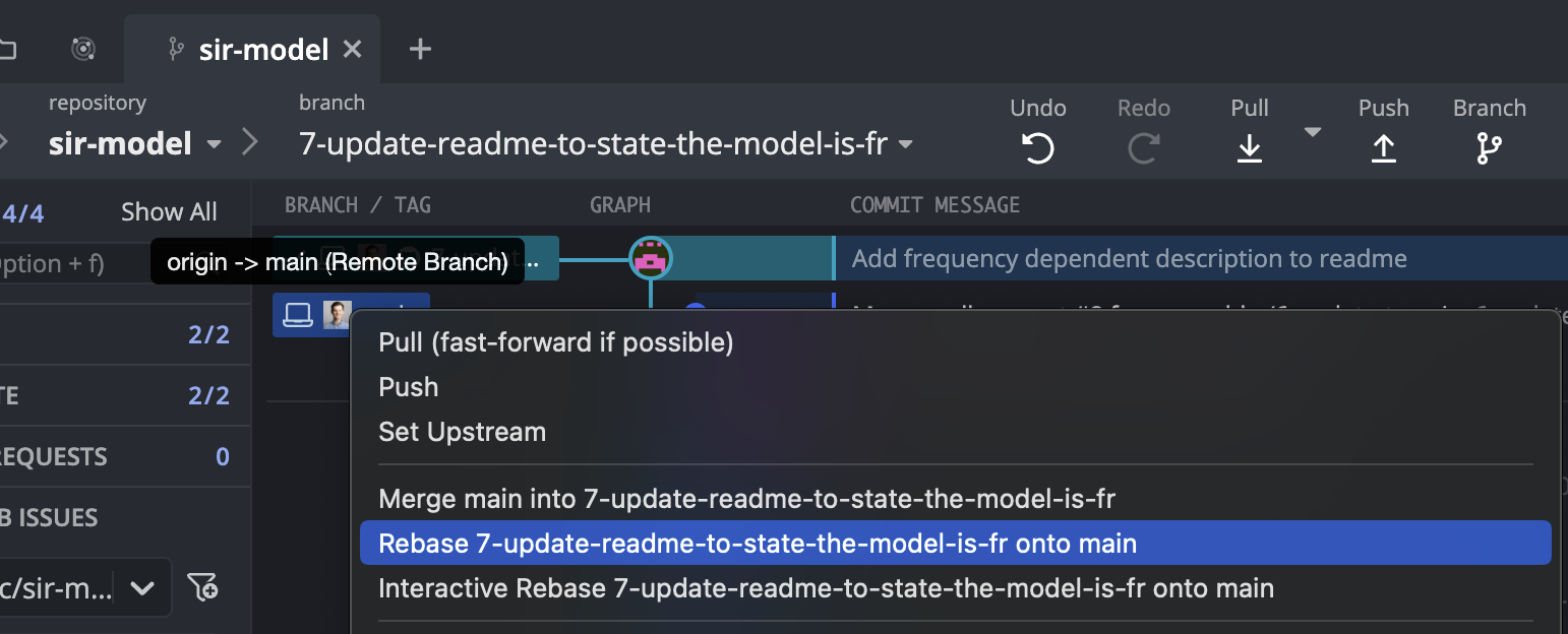 This method requires that your collaborator first updates their main branch to the most recent version that is on the remote. From here, there ensure they are checked out on their feature branch. Right clicking on main will bring up a menu that has the option “Rebase feature branch onto main”.