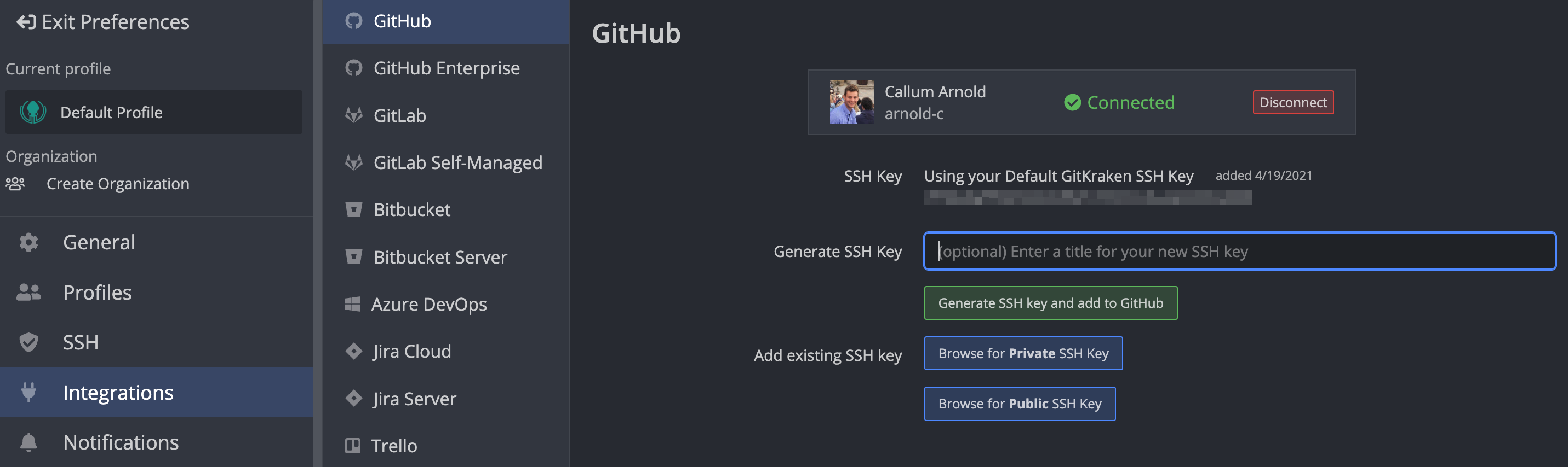 To connect your local Git installation with GitHub, you may want to use SSH keys. GitKraken makes this super easy. From the “Preferences > Integrations > GitHub” window, enter a name for your SSH key e.g., github-ssh and click on the “Generate SSH key and add to GitHub” button. It’s as simple as that!